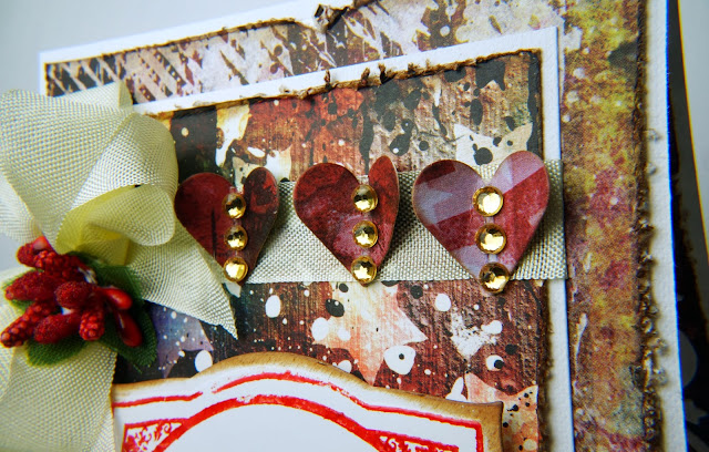 Jag stansade ut texten och de små hjärtana med Spellbinders dies, därefter fäste jag några glittriga rhinestones i mitten av de tre.